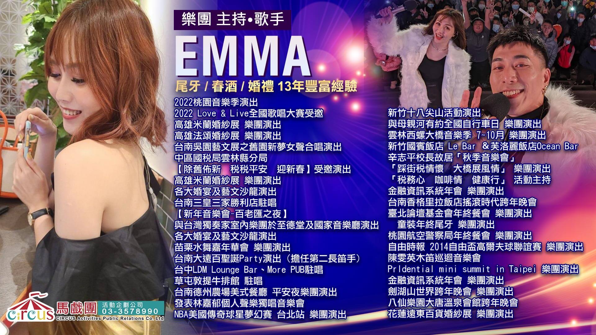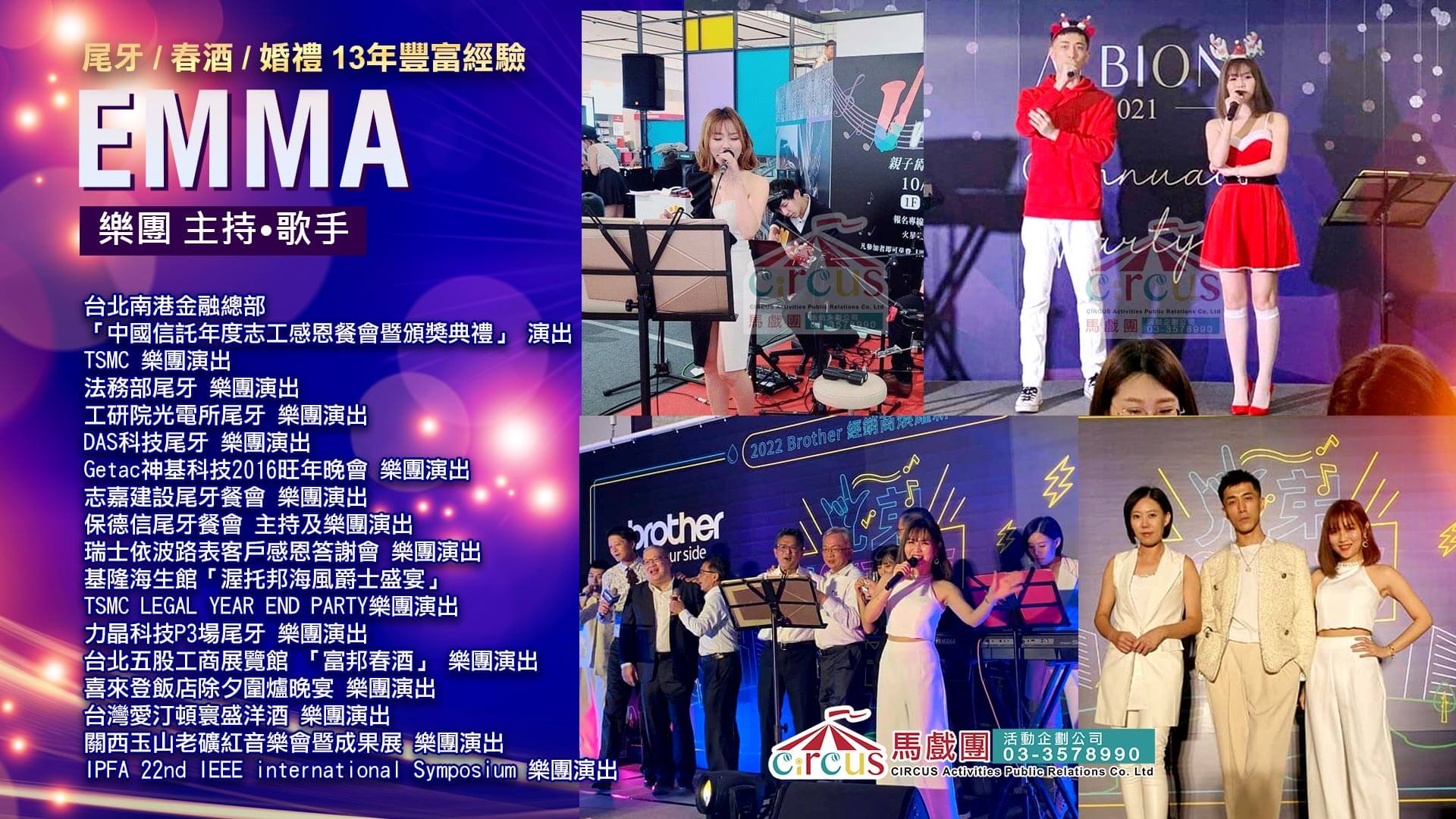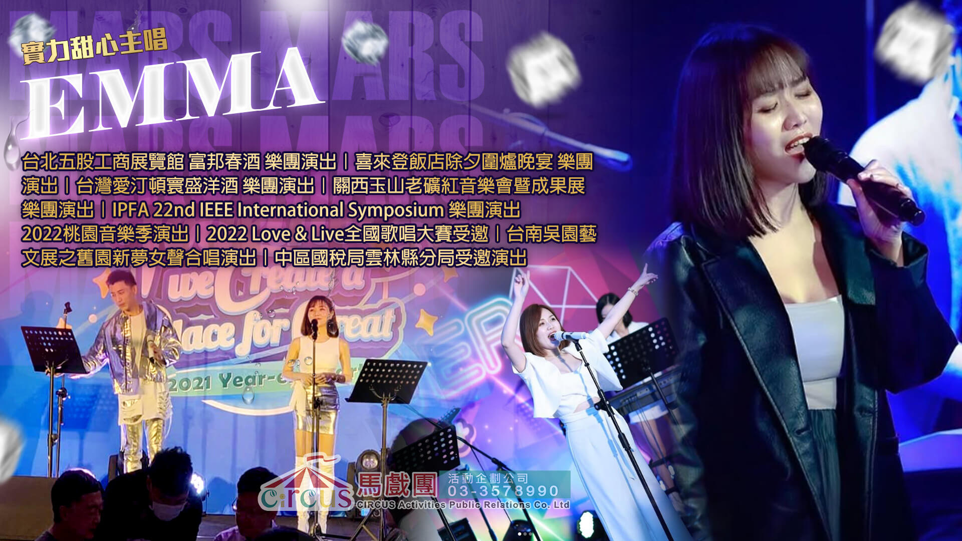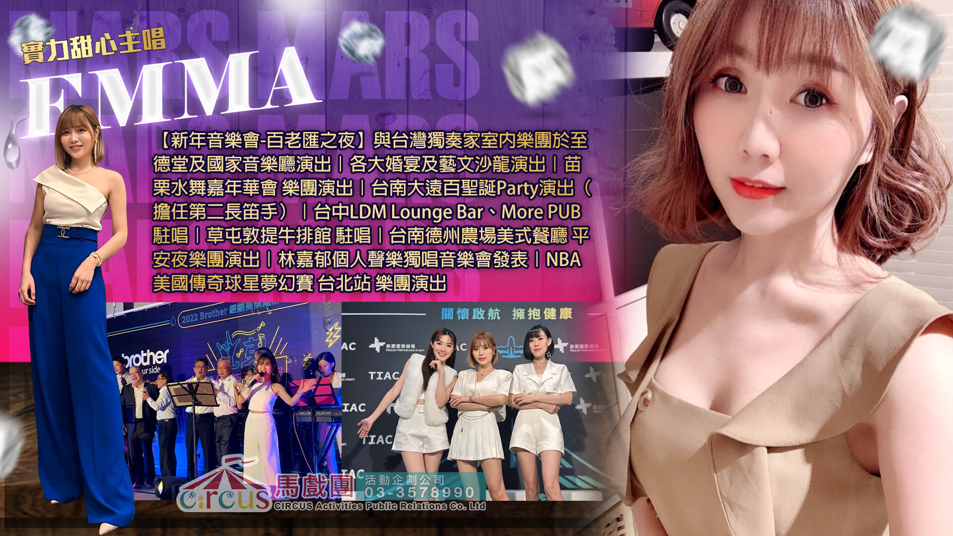 🔸 EMMA 是兼具專業唱功與甜美外型的現場演唱女主唱代表,曾參與《五燈獎》《新人歌唱排行榜》《超級紅人榜》《超級偶像》等節目,擅長詮釋中英流行、節慶開場、溫馨對唱與互動橋段,無論是尾牙主唱、春酒歌手、企業活動女主唱、品牌發表會主唱都能勝任。