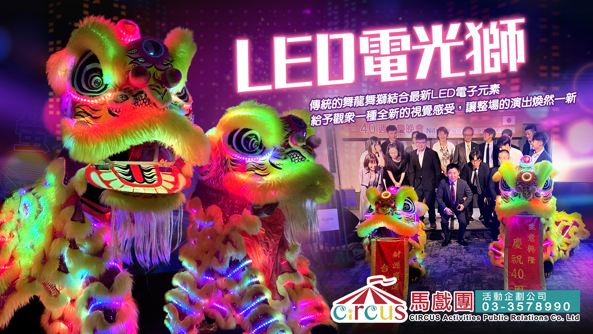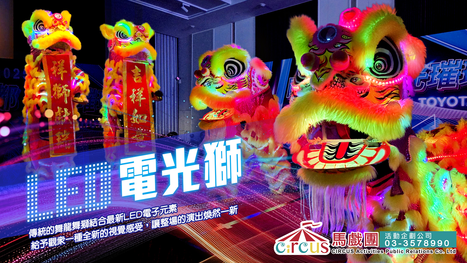 🔸企業標語對聯製作|🔸霓虹獅子迎賓合影|🔸LED舞獅進場特效|🔸配合跨年舞台燈控同步|🔸財神跳加官互動|🔸戰鼓升級 LED 螢光鼓陣