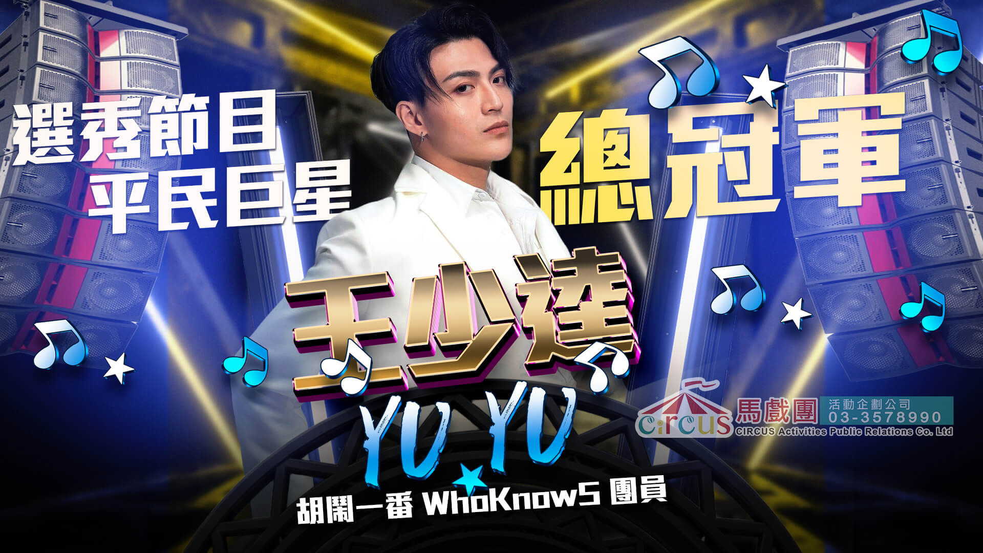 YUYU 王少逵為選秀節目《平民巨星》總冠軍,擁有極佳的現場演出能力,能夠快速帶動氣氛、融入現場觀眾互動,是企業活動與婚禮晚宴的超人氣男主唱。表演曲風從經典老歌、華語金曲到西洋搖滾都能駕馭,曾與蔡依林、A-Lin 等藝人同台合作,舞台氣場十足。