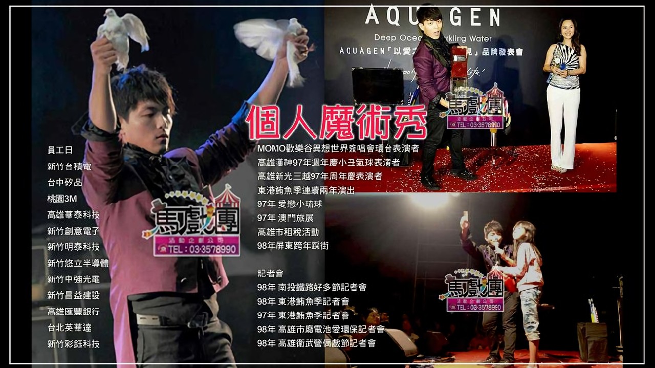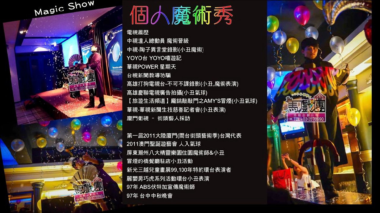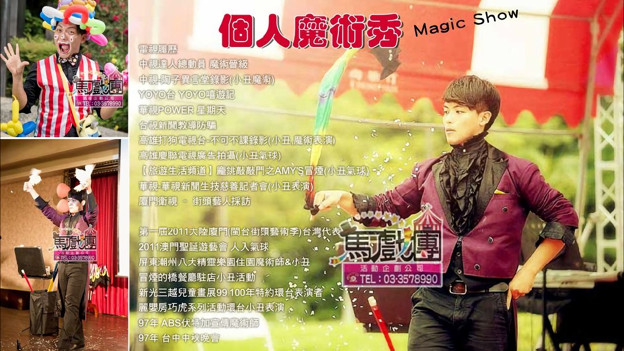 電視履歷: 中視達人總動員 魔術晉級 /中視-陶子異言堂錄影(小丑魔術) /YOYO台 YOYO嘻遊記 /華視POWER 星期天 /台視新聞教導防騙/高雄打狗電視台-不可不課錄影(小丑,魔術表演) /高雄慶聯電視廣告拍攝(小丑氣球) /【旅遊生活頻道】龐銚敲敲門之AMY'S冒煙(小丑氣球) /華視-華視新聞生技慈善記者會(小丑表演) /廈門衛視 – 街頭藝人採訪